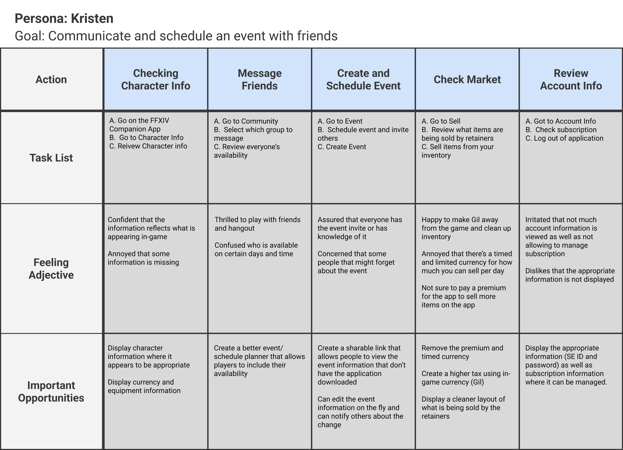 Created a competitive audit to help find similarities and differences that perform similar functions to the FFXIV Companion App. Conducted user interviews with full-time students to working adults that mainly play the game Final Fantasy XIV Online.