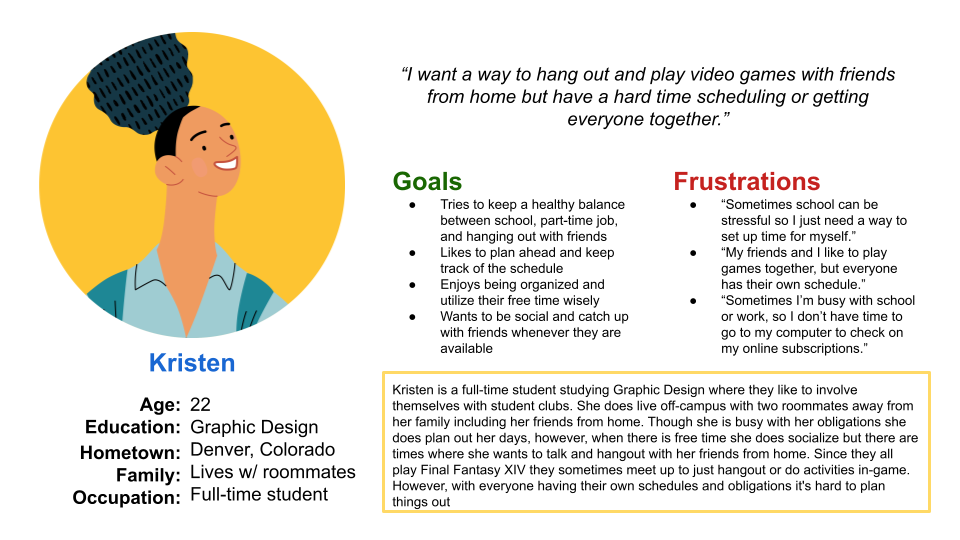 Kristen is a productive student who needs a way to view their FFXIV account, and communicate with their friends to organize in-game meetups